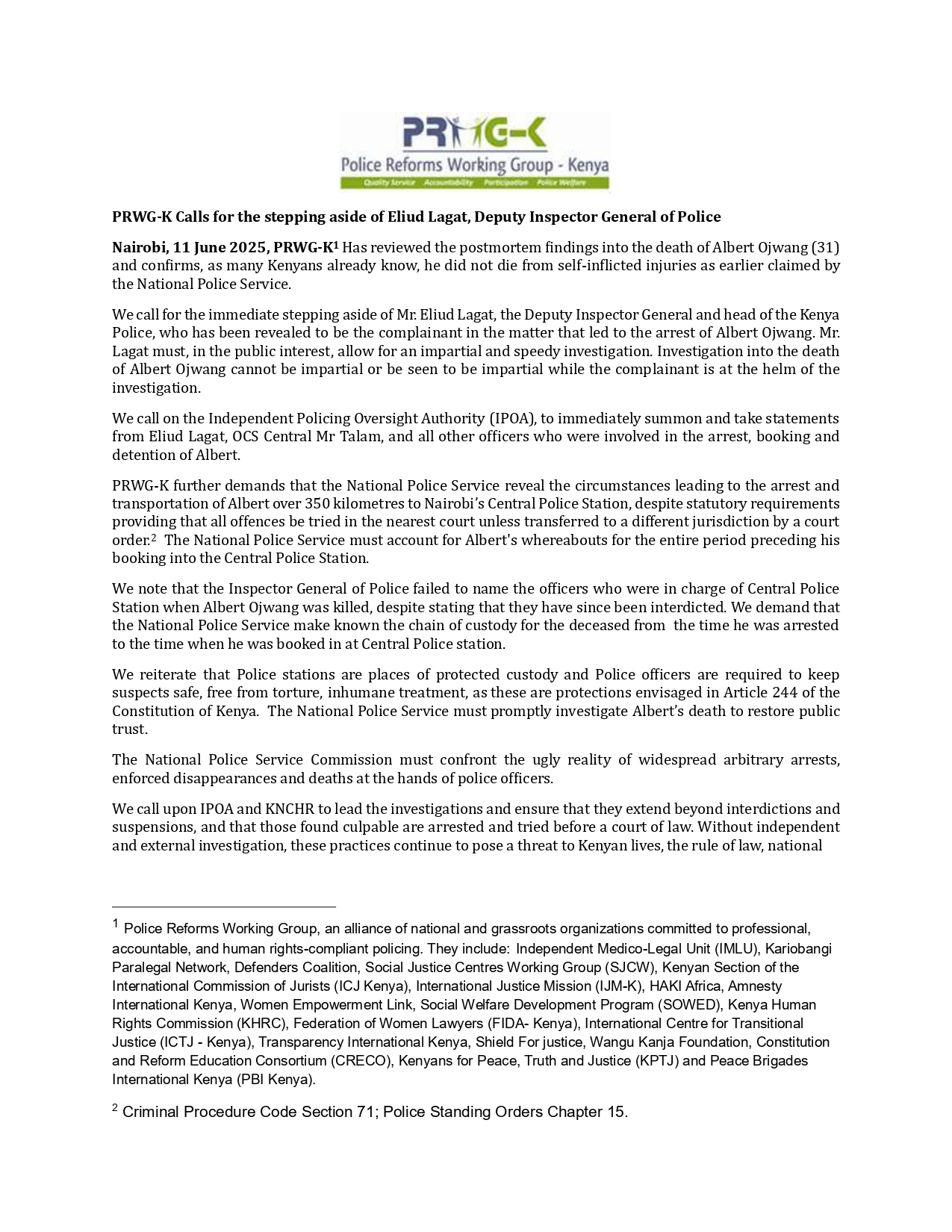We join the PRWG-K in calling for the immediate stepping aside of Mr. Eliud Lagat, the Deputy Inspector General and head of the Kenya Police, who has been revealed to be the complainant in the matter that led to the arrest of Albert Ojwang. Mr. Lagat must, in the public interest, allow for an impartial and speedy investigation. Investigation into the death of Albert Ojwang cannot be impartial or be seen to be impartial while the complainant is at the helm of the investigation.